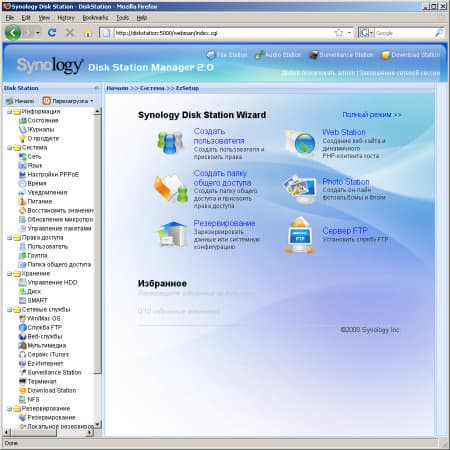 На первой странице можно увидеть ссылки на настройки для нескольких популярных функций (создать пользователя, общую папку и т. п.). Для удобства пользователь может самостоятельно добавить в это окно до десяти своих ссылок на наиболее часто используемые настройки. В верхней части окна есть кнопки для перехода к другим мини-сайтам (в частности, файлы, видеонаблюдение) без повторного ввода имени и пароля.