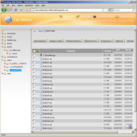 - Download Station — автономнаясистема загрузки файлов по протоколам FTP/HTTP/BitTorrent/eMule/NZB. Новая версия прошивки имеет отдельный мини-сайт для управления загрузками. На нем устанавливаются и параметры служб. Для FTP можно выбрать число одновременных подключений к одному серверу. Для BitTorrent — максимальное число активных задач (до 20), порт, ограничение скорости и числа коннектов, шифрование, параметры остановки задачи (время и/или рейтинг, позже их можно менять для каждой загрузки независимо). Возможен выбор отдельных файлов из торрента для загрузки. Кроме eMule поддерживается также Kad. Можно управлять списком серверов. Допускается только одно подключение к серверу. Предусмотрена встроенная функция поиска. На раздачу ставится все, что есть в целевой папке, например, скачанные торрентом файлы (если папки загрузки по этим протоколам совпадают). Данная опция реализована очень качественно. Конечно, до настольного компьютера ей далеко, однако большинство стандартных функций она выполняет. Протокол NZB используется для загрузки файлов из конференций Usenet по сходному с BitTorrent принципу. Скриншоты настройки и работы сервиса: 1, 2, 3, 4;