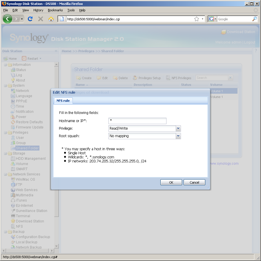 Наконец, возможность работы с NFS оформлена через Web-интерфейс. Кроме включения данного протокола, для каждой папки можно указать определенные права доступа с указанием IP-адресов клиентов и типа доступа (чтение или чтение/запись).