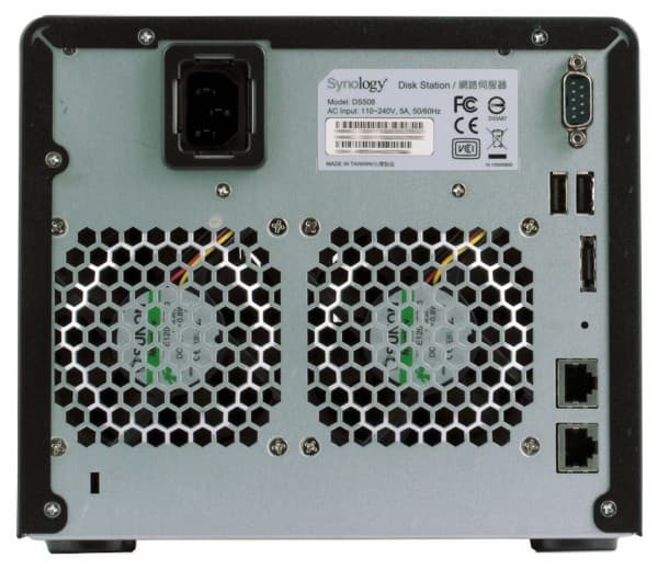 Все разъемы собраны на задней панели — питание, два порта USB 2.0, консольный порт RS232, два сетевых порта, порт eSATA. Также здесь находится кнопка сброса, замок Кенсингтона и решетки двух вентиляторов системы охлаждения.