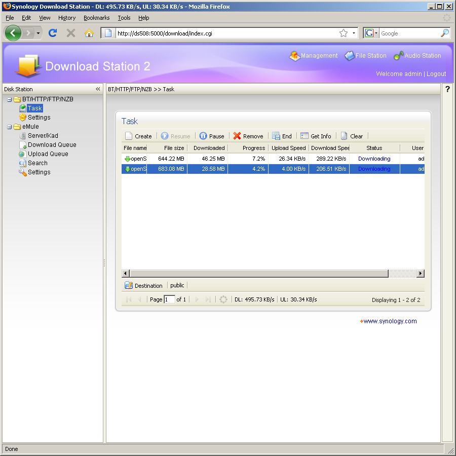 Автономная загрузка файлов в данной прошивке поддерживает также протоколы eMule/Kad и NBZ. Для управления заданиями вместо одной страницы в интерфейсе администратора теперь используется отдельный минисайт. Для торрентов, в которых много файлов, можно выбирать какие загружать, а какие нет.