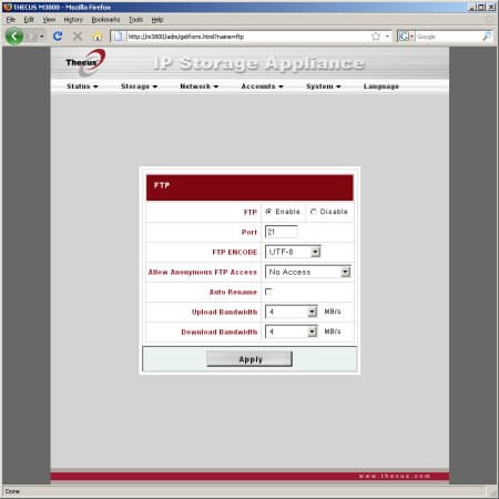Встроенный планировщик задач резервного копирования может использоваться для бекапа общих папок сервера на другие устройства в сети. Предусмотрено два варианта — второй сетевой накопитель от Thecus или сервер FTP. У нас было только одно устройство, так что первый вариант не проверялся. Хотя скорее всего как раз в нем все будет в порядке. А вот записать средствами накопителя данные на сервер FTP, работающий на устройстве от Synology у нас не получилось.