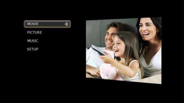 Основное меню плеера состоит из привычных четырех пунктов — видео, фото, музыка, установки. Отметим, что все это на английском языке, но самих текстов в принципе настолько мало, что особых проблем это не вызывает. Настройки собраны в пяти пунктах — выбор режима экрана (тип подключения, формат, стандарт, разрешение), режим проигрывания музыки (случайный порядок, повтор альбома, повтор песни), громкость аудиовыходов, сброс настроек, выбор языка субтитров (есть CP1251 и Unicode).