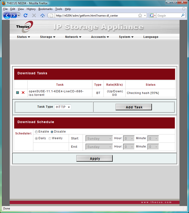 Станция загрузки файлов справляется с протоколами HTTP, FTP и BitTorrent. Для ее работы используются утилиты wget и rtorrent. Первый вполне удобен и управляем — можно задавать ограничения на скорость скачивания, имя и пароль пользователя (для FTP). А вот работа с торрентами выглядит грустно — мало того, что нельзя выбрать порты работы, так они еще и неизвестны (их можно найти в документации на программу). Кроме того, нет возможности раздачи после загрузки, а максимальное число всех активных задач составляет пять. Хотя последний момент конечно характерен для подобных низкопроизводительных платформ. Так что единственными плюсами можно назвать выбор директории для загрузки для каждого задания индивидуально и работу по расписанию.