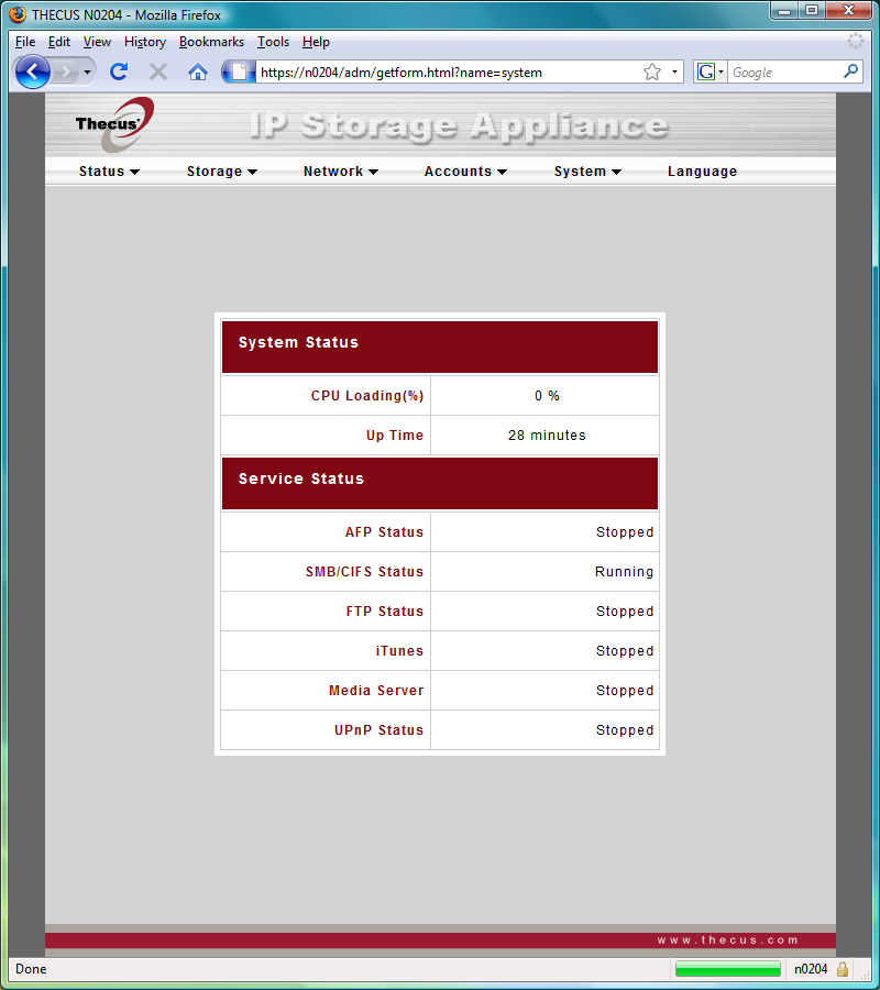 Традиционное меню от компании Thecus оформлено в стандартном виде — в верхней части окна список с раскрывающимися пунктами, а центральную часть окна занимает непосредственно информация страницы и поля ввода.