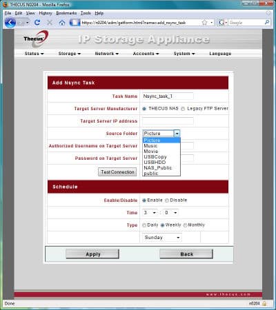 Второй возможностью повышения надежности хранения данных методом бекапа на другое устройство является сетевое копирование. Для него можно использовать как устройства от Thecus, так и любой FTP-сервер. Первый вариант может быть более безопасен, поскольку работает через шифрованный VPN-канал между накопителями. С другой стороны, FTP более универсален, так как не требует именно устройства от Thecus в качестве сервера. Система работает по расписанию, поддерживает несколько заданий и копирует общие папки только целиком. Возможность работы сервером для Nsync (так это все называется) включается в последнем пункте третьей группы страниц Web-интерфейса.