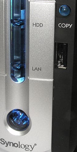 кнопка питания и разъем USB с кнопкой COPY над ним (предназначена для копирования на внутренний винчестер содержимого USB-дика с FAT32). На заднем выходное отверстие маленького (2,5 см) и потому шумноватого вентилятора, разъем eSATA, кнопку RESET, еще 2 разъема USB, RJ45 и разъем питания, а также ушко для кабеля безопасности.