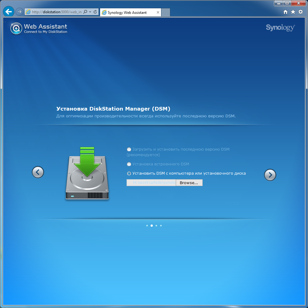 Устройство имеет встроенный флэш-накопитель со специальным установочным образом, так что для форматирования дисков и инсталляции DSM потребуется только ПК с браузером. При этом пользователь может использовать записанную в устройстве версию, скачать новую из интернета или загрузить готовый файл прошивки. Дополнительно в процессе установки можно изменить имя системы, пароль администратора, создать дисковый массив SHR.