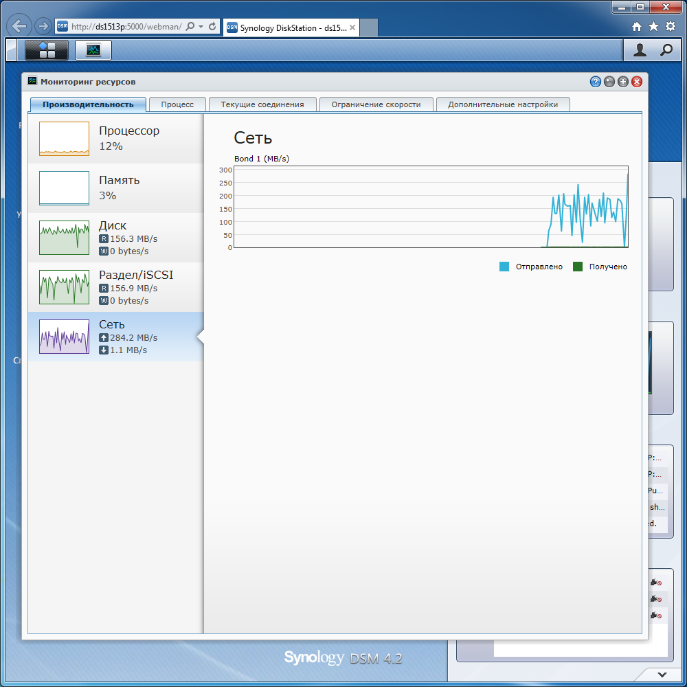 Для проверки возможностей DS1513+ мы использовали специальное оборудование — коммутатор D-Link DGS-3200-10 и четырех клиентов. Все четыре порта сетевого накопителя были подключены к коммутатору и настроены в режиме агрегации портов (802.3ad/LACP). К другим четырем портам коммутатора подключались клиенты гигабитными линками. На сетевом накопителе создавались тома RAID0 и RAID5 из пяти винчестеров WD Red.