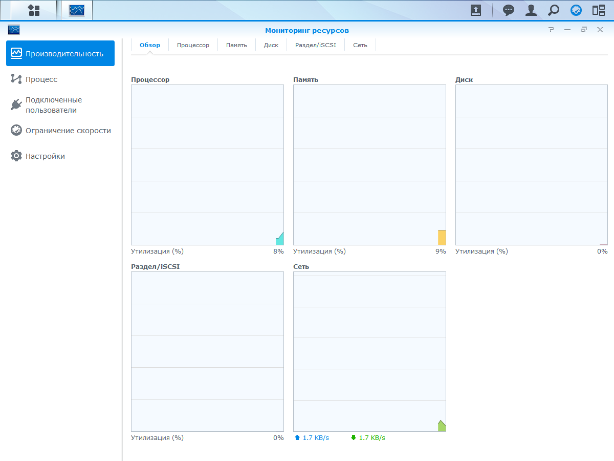 Дополнительные данные о работе устройства можно найти в «Мониторинге ресурсов». Здесь в графическом виде представлены отчеты о загрузке ресурсов, список процессов и подключенные пользователи.