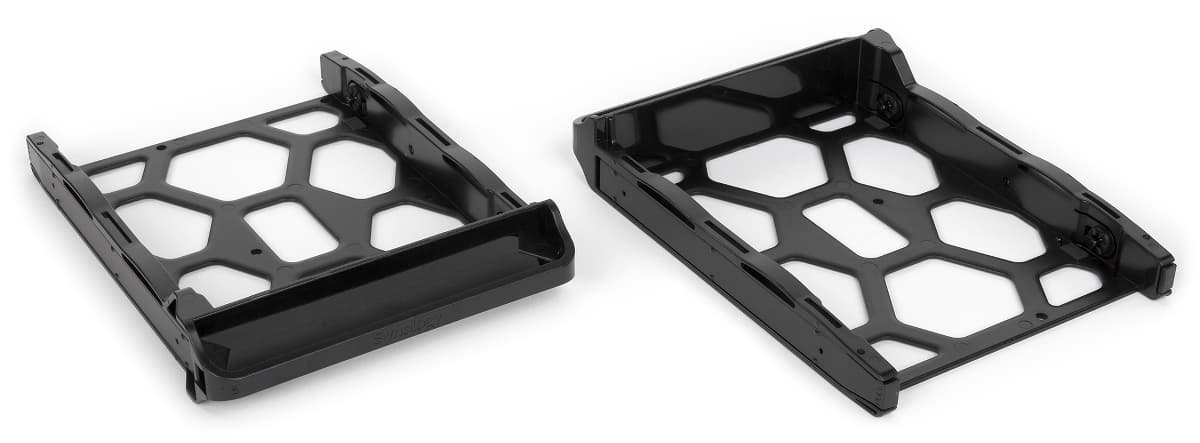 Для моделей 3,5″ не требуется использование инструментов для их закрепления — специальная конструкция пластиковых рамок позволяет надежно удерживать диски на своем месте. При этом присутствуют и резиновые прокладки, призванные снизить шум и вибрации. Сами рамки устанавливаются на простых защелках, дополнительных замков здесь не предусмотрено.