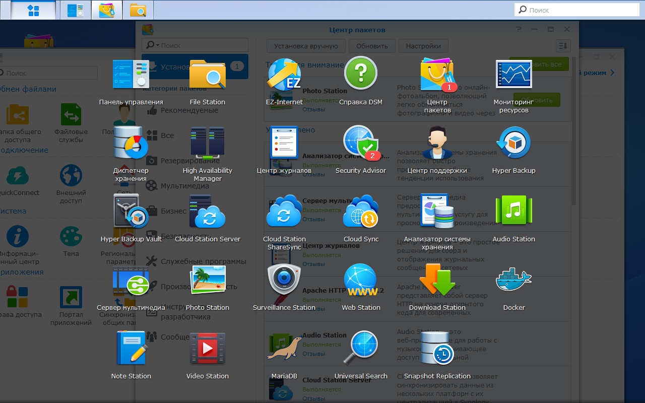 Этой весной компания предложила релиз версии DSM 6.1 для сетевых накопителей начиная с 11-го модельного года. Несмотря на то, что сегодня это программное обеспечение имеет модульную структуру, в которой большинство дополнительных функций реализовано в виде внешних пакетов, заложенные в основной прошивке возможности оказывают существенное влияние. Заметим, что часть возможностей DSM реализуется только на устройствах определенного уровня, что связано с общим уровнем производительности. Кроме того, часть из описанных ниже пакетов имеют статус «бета», что стоит учитывать при коммерческом использовании.