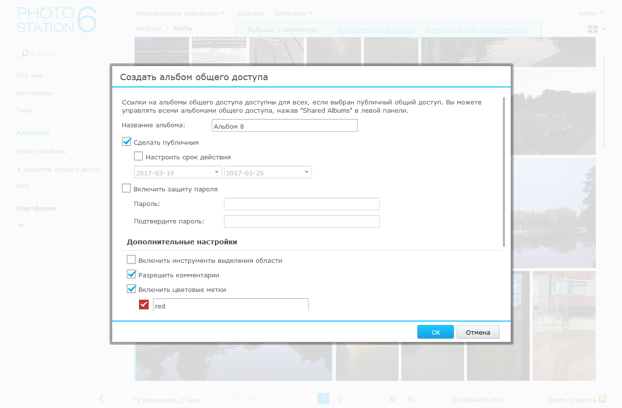 Известный пакет для создания собственных фотоальбомов Photo Station получил несколько новых возможностей. Сервис поддерживает создание альбомов с общим доступом, которые позволяют быстро и удобно поделиться выбранными фотографиями с другими пользователями по простой ссылке для браузера. При необходимости вы можете указать срок действия ссылки или добавить дополнительный пароль для защиты.