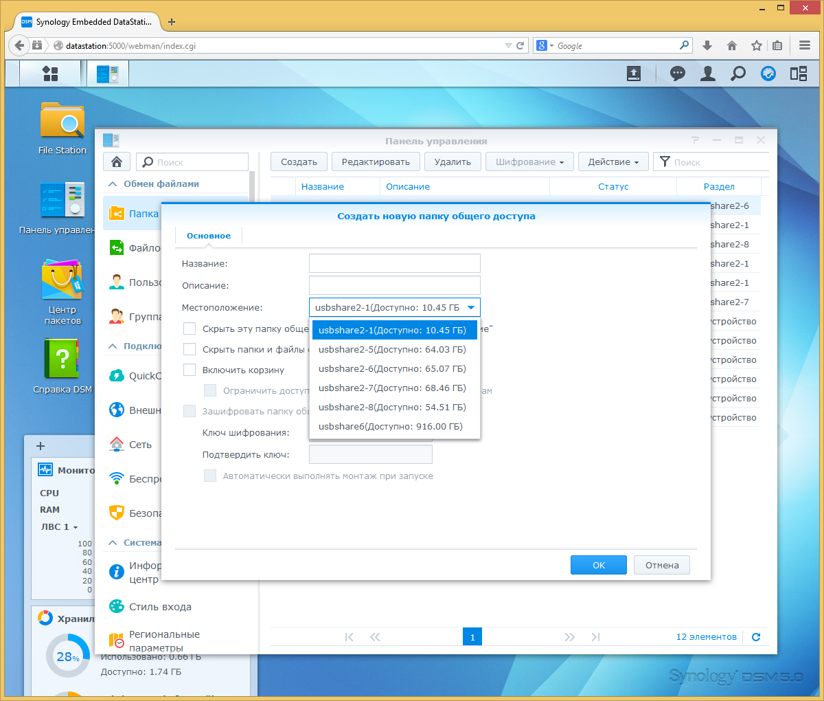 Традиционные сетевые накопители от Synology при работе с внешними дисками обычно представляют каждый раздел в виде одной общей папки. В EDS14 этот вариант расширен возможностью создавать собственные папки на уже существующих разделах. Это позволяет более гибко подойти к организации системы хранения данных, в том числе и для установки прав пользователей, выборочной индексации и других функций. Как и указанные выше системные папки, эти общие ресурсы можно будет в дальнейшем перемещать между разделами. Конечно время, затрачиваемое на эту операцию, будет зависеть от объема записанных файлов и интерфейса дисков.