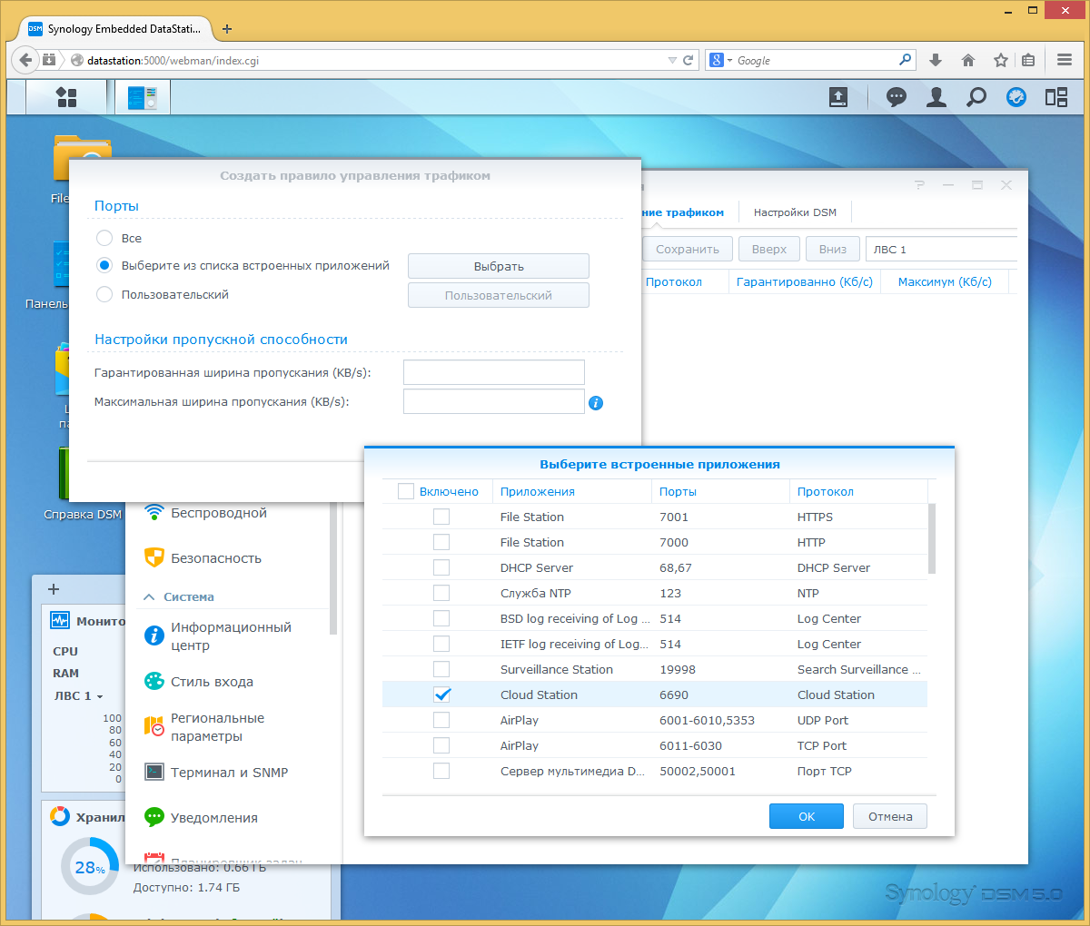Устанавливаемые дополнительные программные пакеты обычно доступны через основной интерфейс DSM. Но есть возможность и прямого доступа к ним с использованием псевдонима (добавления названия папки после имени хоста и номера порта) или по выделенным портам для HTTP и HTTPS. Эти настройки осуществляются в пункте «Портал приложений».