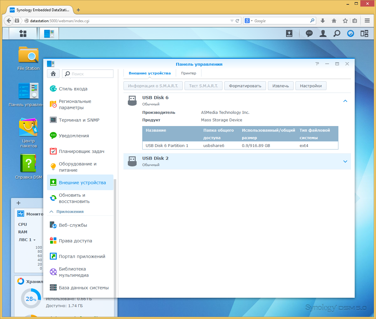 В главном меню по понятной причине отсутствует раздел «Диспетчер хранения». Данная модель работает только с внешними накопителями и не имеет никаких функций по реализации RAID-массивов и томов iSCSI. При необходимости повышения отказоустойчивости можно использовать DAS-устройства с этим функционалом. Правда состояние таких массивов удаленно проконтролировать не получится. На подключаемых дисках поддерживаются файловые системы EXT3/4, FAT, NTFS и HFS+ (том не более 2 ТБ, только для чтения). Можно использовать несколько разделов и USB-хабы.