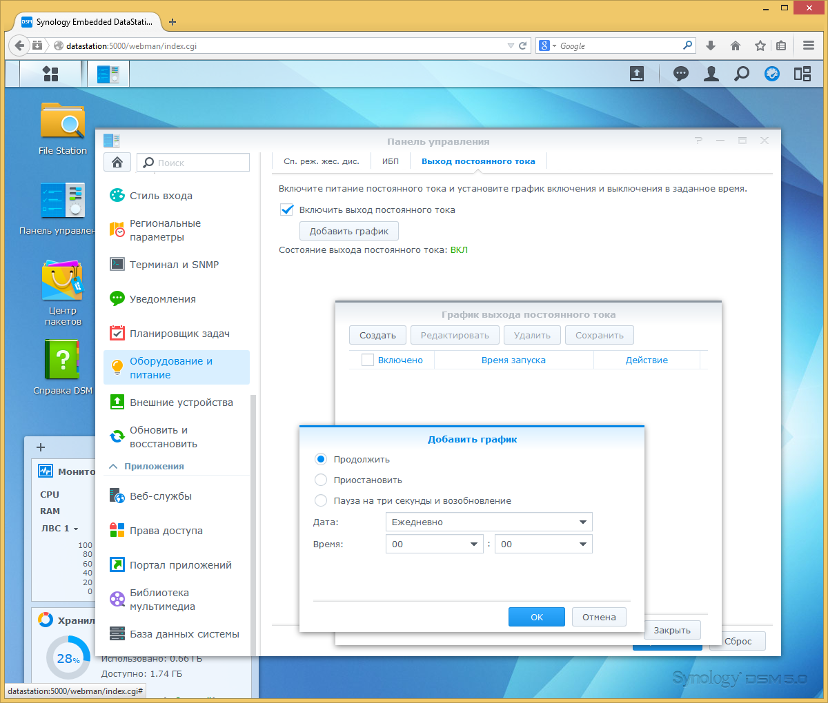 Накопитель не имеет вентиляторов, поддержки WOL и управления питанием, так что в разделе «Оборудование и питание» мы видим только настройку спящего режима USB-накопителей, настройку ИБП и программирование расписания работы выхода питания постоянного тока. Последняя возможность может пригодиться при подключении специализированного оборудования.