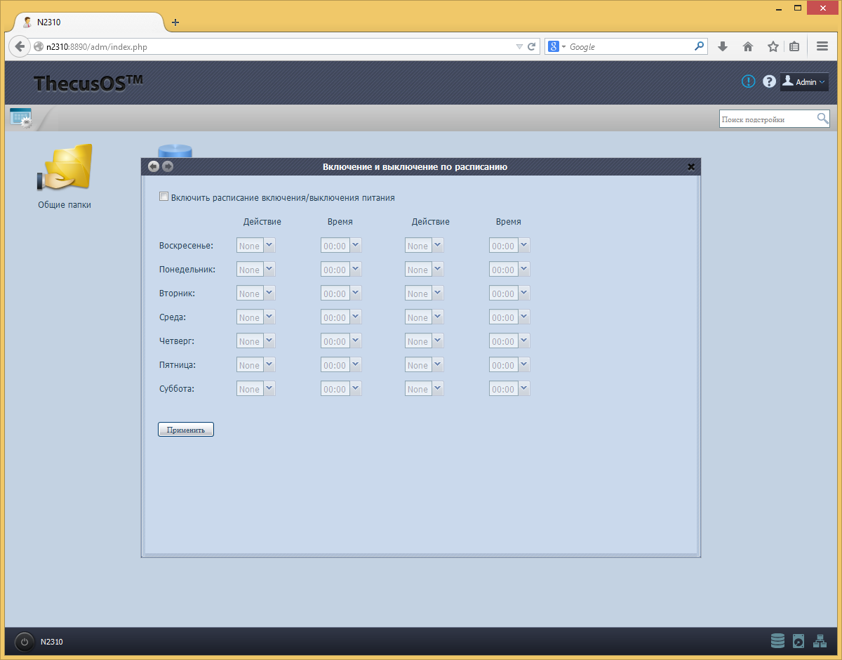 Первая из них — «Управление системой». Здесь можно настроить сетевые параметры (заявлена поддержка Jumbo Frames и IPv6, а вот WOL в этой модели отсутствует), установить время и дату, изменить пароль администратора, сохранить/восстановить/сбросить конфигурацию, перезагрузить или выключить устройство, запрограммировать расписание работы (по два действия на каждый день недели, точность выбора времени — пять минут), разрешить проверку файловой системы диска при следующей перезагрузке, разрешить добавление значков дополнительных функций на стартовый экран входа в систему.
