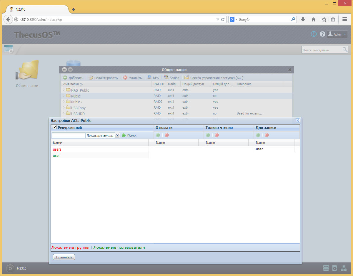 В настройках общих ресурсов нет ничего необычного. Можно использовать автоматически создаваемые при инициализации папки или запрограммировать свои. Далее указываются права доступа для пользователей и групп, а также разрешения для работы по протоколу NFS. В некоторых ситуациях может оказаться полезной возможность резервного копирования и восстановления прав доступа к файлам на томах.
