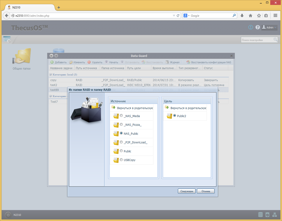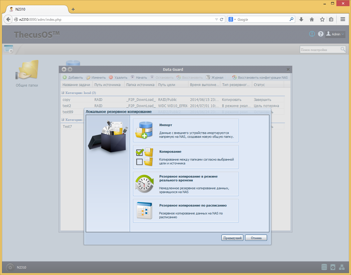 Сетевой накопитель может выступать в роли сервера Rsync для резервного копирования данных с других систем. С точки зрения встроенных возможностей резервного копирования данных, предусмотрено два варианта — работа с удаленными серверами Rsync или с собственными папками и подключаемыми локально внешними дисками.