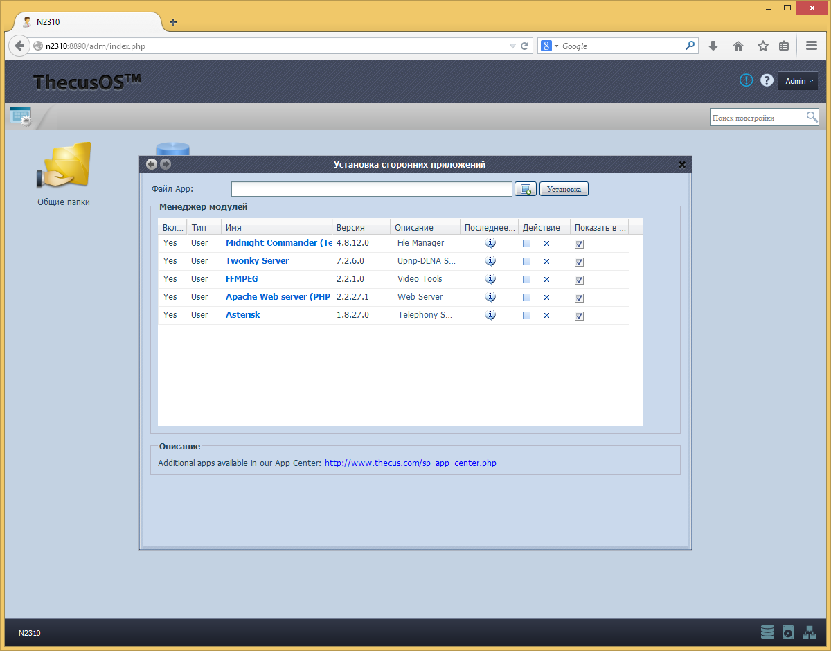 Второй вариант — установка модулей в виде готовых файлов специального формата. Загрузить их можно с сайта производителя или других ресурсов. На момент написания статьи среди них можно было заметить такие известные приложения как Apache, Asterisk, CouchPotato, Java, Midnight Commander, MiniDLNA, MLDonkey, NZBGet, OwnCloud, Twonky Media Server (требуется лицензия), XMail.