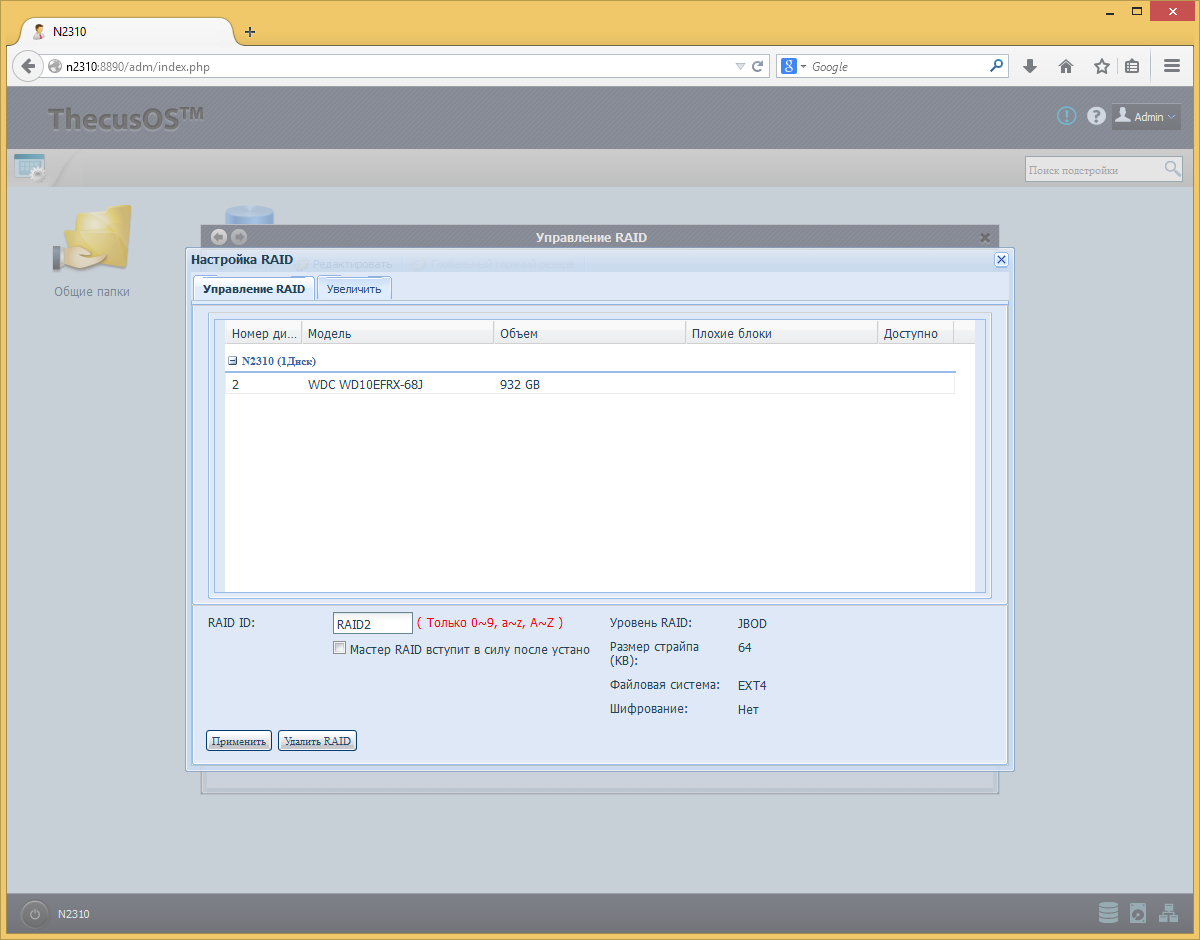 В разделе «Управление RAID» пользователь может создавать и удалять дисковые массивы. Устройство поддерживает работу с одиночными дисками, а также режимы JBOB, RAID0 и RAID1.