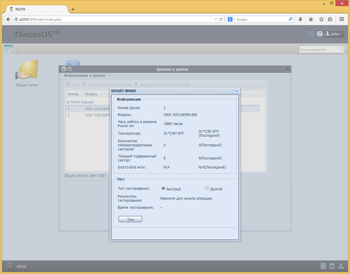 Для обслуживания винчестеров предусмотрено сканирование на сбойные блоки и проверка статуса SMART, включая запуск короткого или длинного теста. Возможности использования спящего режима дисков в случае отсутствия активности пользователя мы не обнаружили.