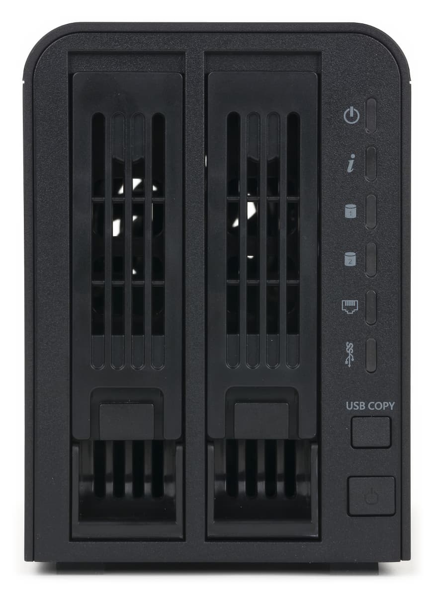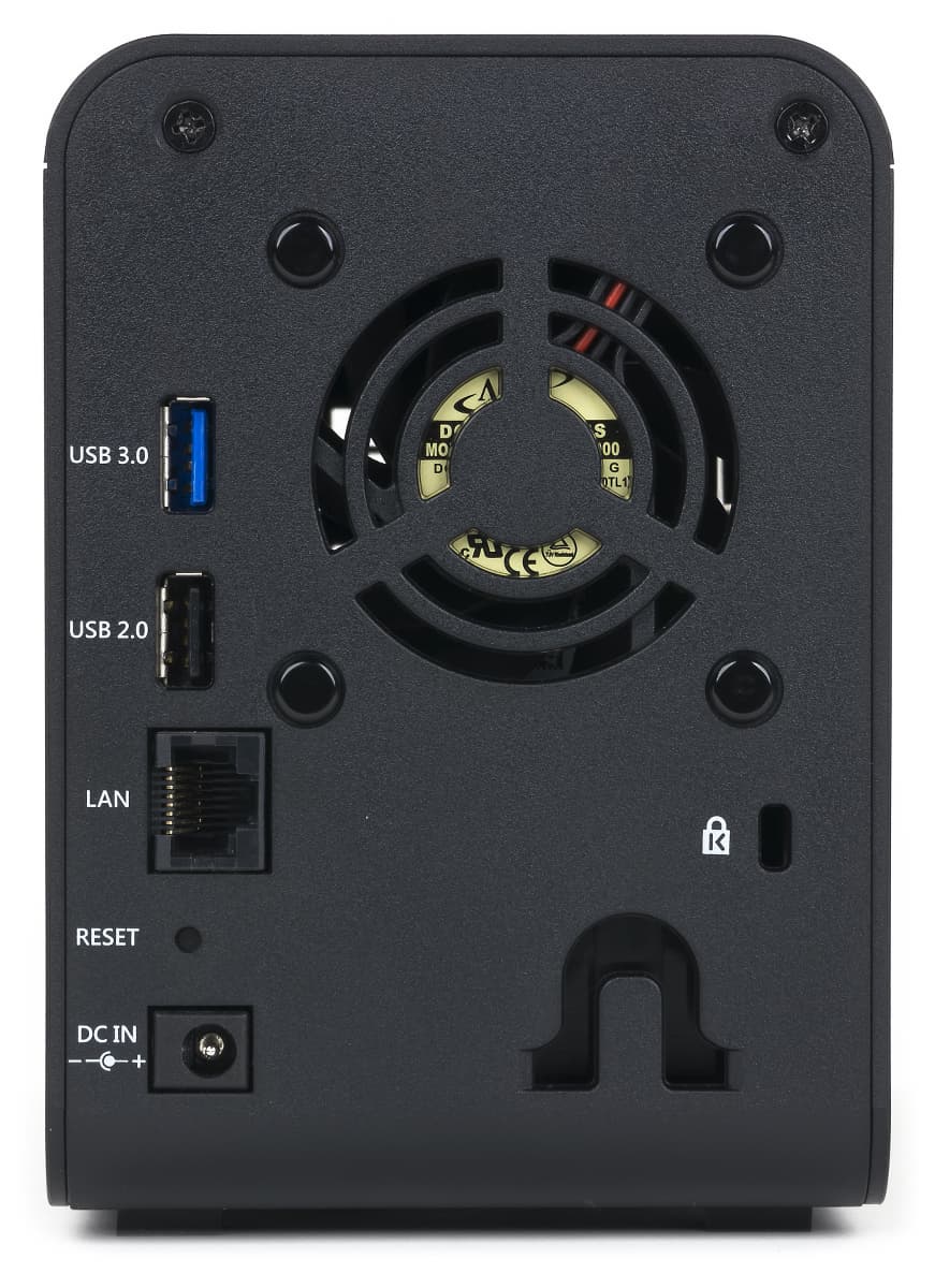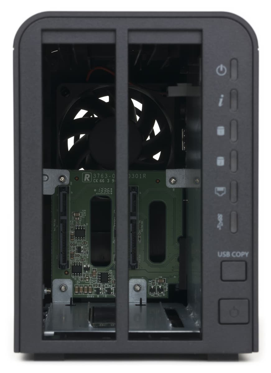 По правому краю вертикально расположены шесть индикаторов работы устройства, кнопки USB Copy и включения питания. Сзади мы видим решетку вентилятора, порты USB 3.0 и USB 2.0, сетевой порт, скрытую кнопку сброса, вход блока питания, специальный элемент для крепления его кабеля и кенсингтонский замок (хотя, конечно, его реализация на стенке из пластмассы немного спорна).
