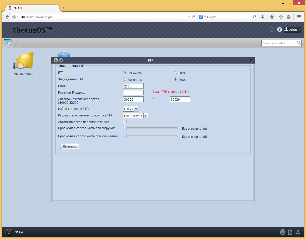 Накопитель поддерживает большинство популярных протоколов сетевого доступа к файлам: Samba/CIFS, AFP, NFS, FTP, WebDAV. Для первого из них можно использовать корзину для удаленных по сети файлов. В ее параметрах указывается продолжительность хранения документов и максимальный объем одного файла. AFP поддерживает работу сервиса Time Machine, папку для которого пользователю нужно будет выбрать. Сервер FTP поддерживает шифрование, пассивный режим и кодировку UTF-8. В настройках можно изменить номера портов и установить ограничения скорости загрузки и отдачи. WebDAV поддерживает протоколы HTTP и HTTPS, а номера портов сервиса доступны для установки пользователем.