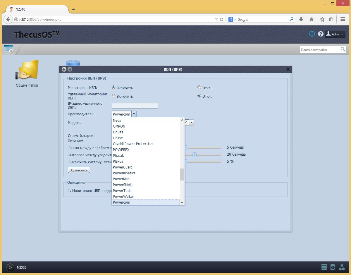 Список совместимости с ИБП достаточно большой. Пользователь может выбрать задержку перед первым уведомлением о потере питания, интервал между сообщениями и уровень заряда батареи, после которого устройство безопасно выключается. Отметим, что реализована поддержка и сетевых ИБП.