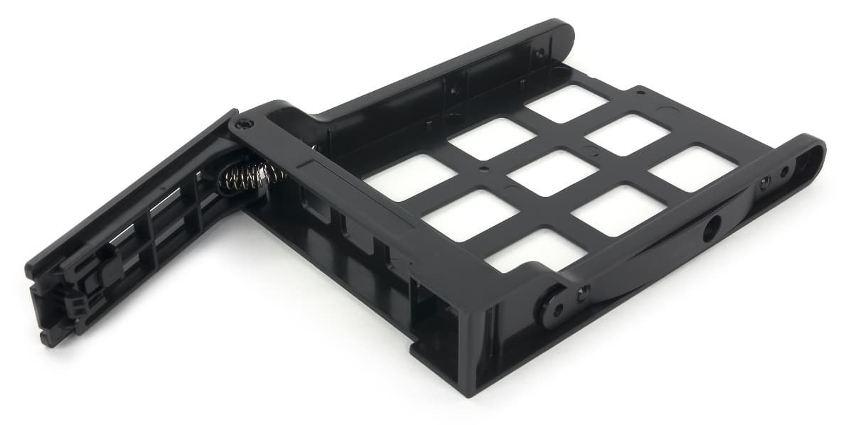 На передней панели видны два отсека для винчестеров. Диски предварительно нужно прикрепить к рамкам. Все их элементы, кроме пружин для защелки, выполнены из пластика. Учитывая, что менять диски часто не придется, маловероятно, что это скажется на долговечности. Отметим наличие специальных распорок, которые помогают рамкам плотно сидеть в своих отсеках.