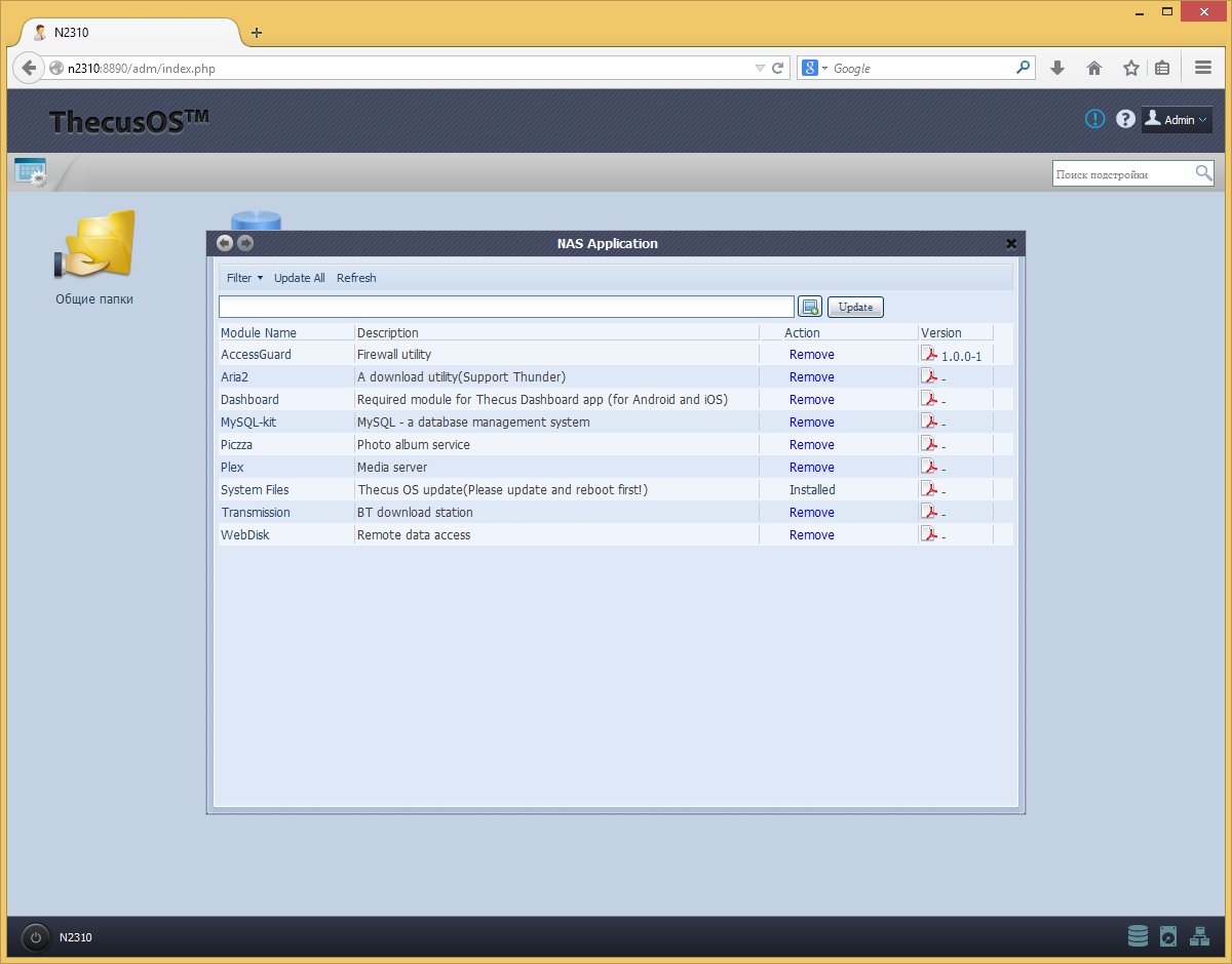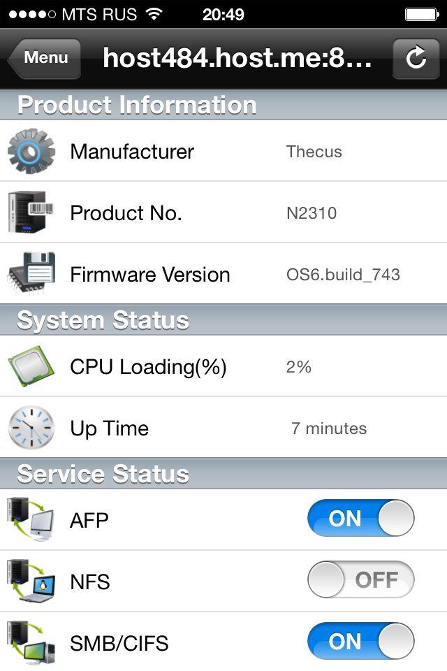 Из мобильных утилит стоит упомянуть Thecus Dashboard и T-OnTheGo для платформ Android и iOS. Первая позволяет контролировать состояние устройства, управлять сервисами и менять пароли пользователям. Напомним, что для ее работы требуется установить на накопитель одноименный модуль и пробросить на роутере порт для основного веб-интерфейса. Желательно при этом изменить номер этого порта на нестандартный в настройках устройства.