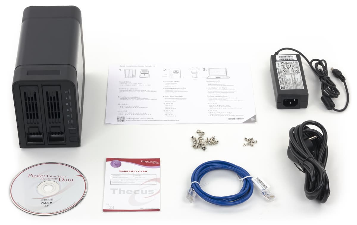 Комплект поставки состоит из накопителя, внешнего блока питания (12 В 3,33 А), кабеля для него, сетевого патч-корда необычного голубого цвета, комплекта винтов для крепления 3,5″ и 2,5″ винчестеров (причем их положили с явным запасом, что приятно), гарантийного талона, компакт-диска с электронной версией документации и утилитами для поиска устройств в сети, и листовки на нескольких языках с описанием начала работы с устройством.