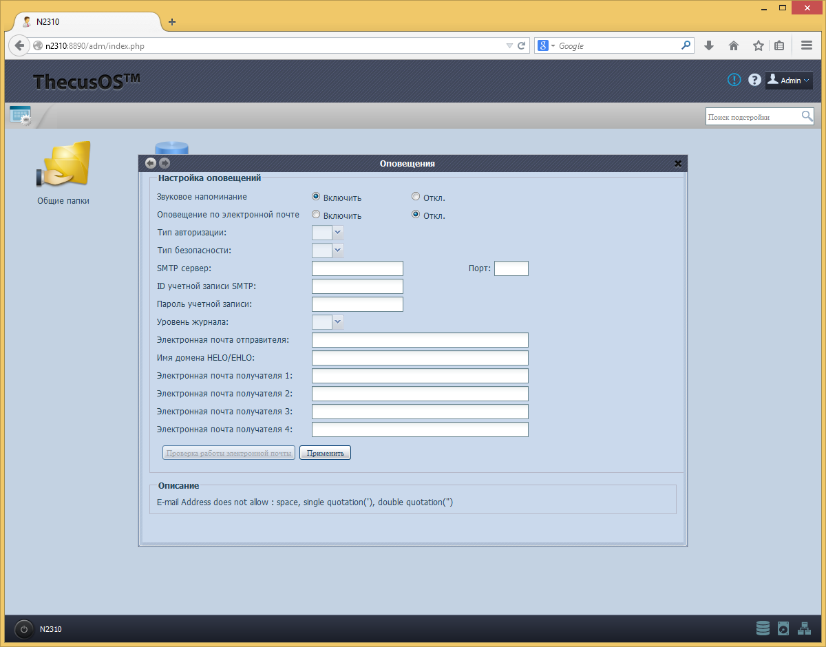 Что касается проверки статуса накопителя, то предоставляется информация об имени, версии прошивки, времени работы и активных сервисах. Предусмотрен журнал системных событий и протоколирование операций по некоторым протоколам (в том числе FTP и SSH). Кроме того, устройство может выступать в роли клиента или сервера Syslog. Для оперативного информирования администратора используется электронная почта (до четырех адресов получателей).