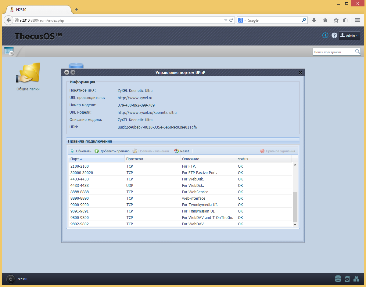Для обеспечения удаленного доступа при динамическом адресе на роутере, в накопителе предусмотрен клиент DDNS с поддержкой DynDNS, ZoneEdit и No-IP. Если роутер работает с протоколом UPnP, то пользователь может запрограммировать правила трансляции портов требуемых сервисов прямо из интерфейса накопителя. Жаль только, что некоторые из портов пробрасываются без ведома пользователя, что не очень хорошо.