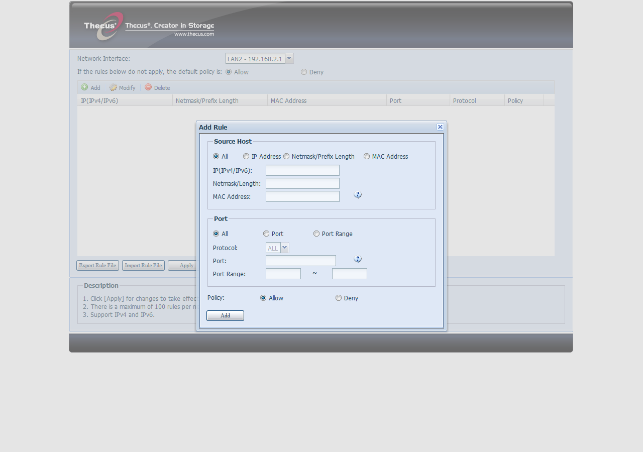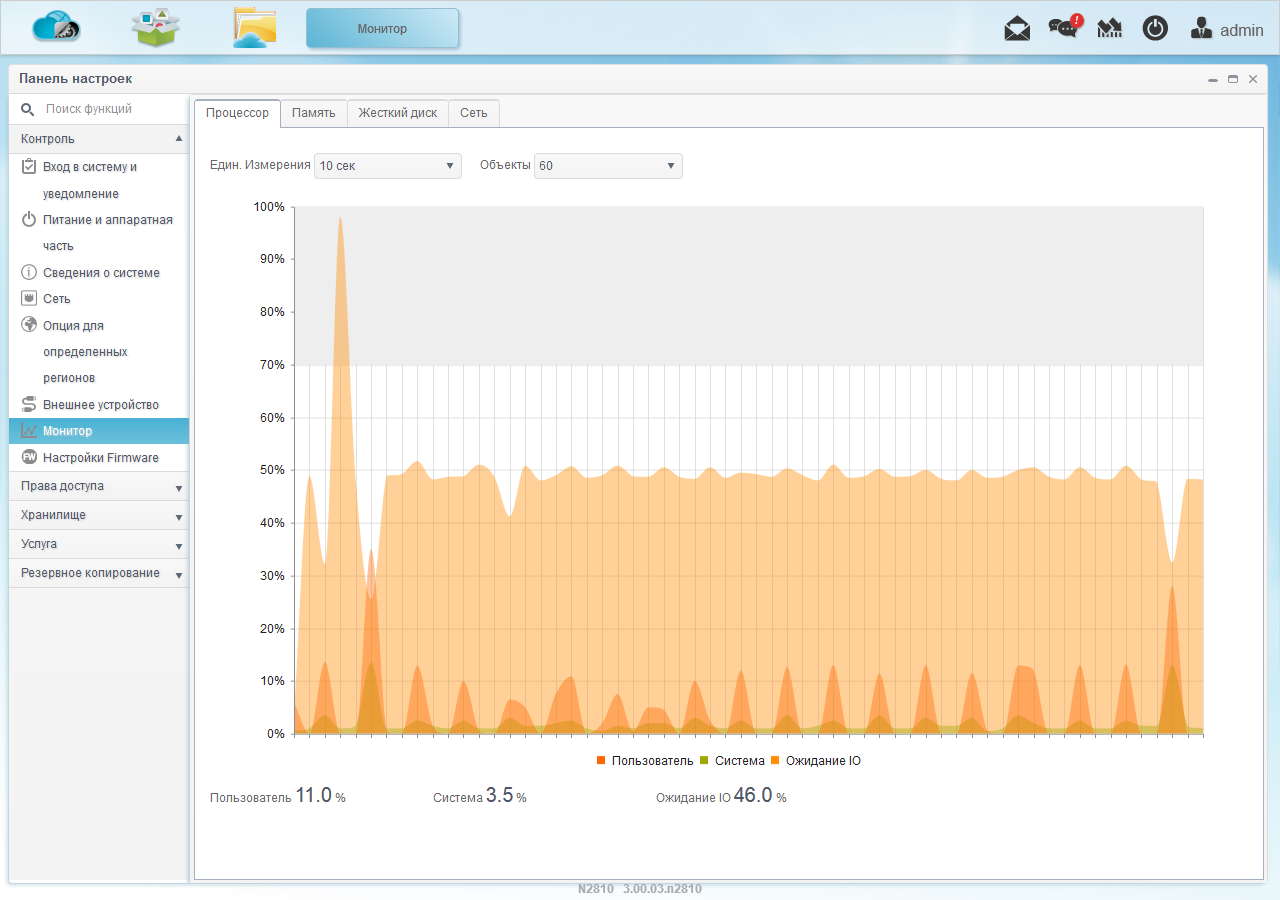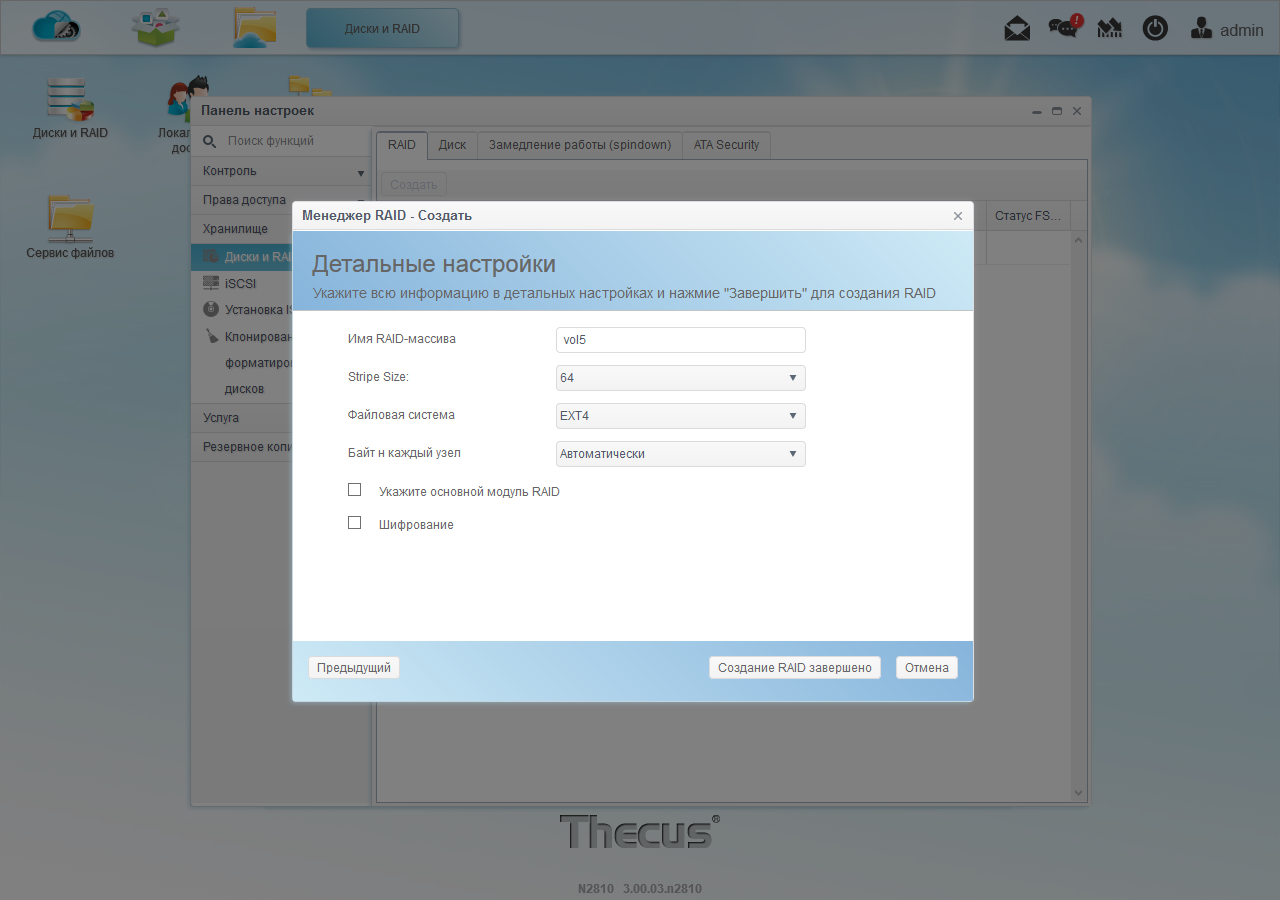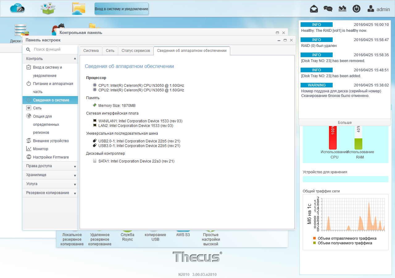 Данная модель использует обновленную версию встроенной операционной системы Thecus OS 7. Она получила обновленный интерфейс и несколько новых функций. Отметим, что русская версия здесь есть, но качество перевода среднее. Предусмотрена возможность использования шифрованного подключения HTTPS, а также изменения номеров портов.