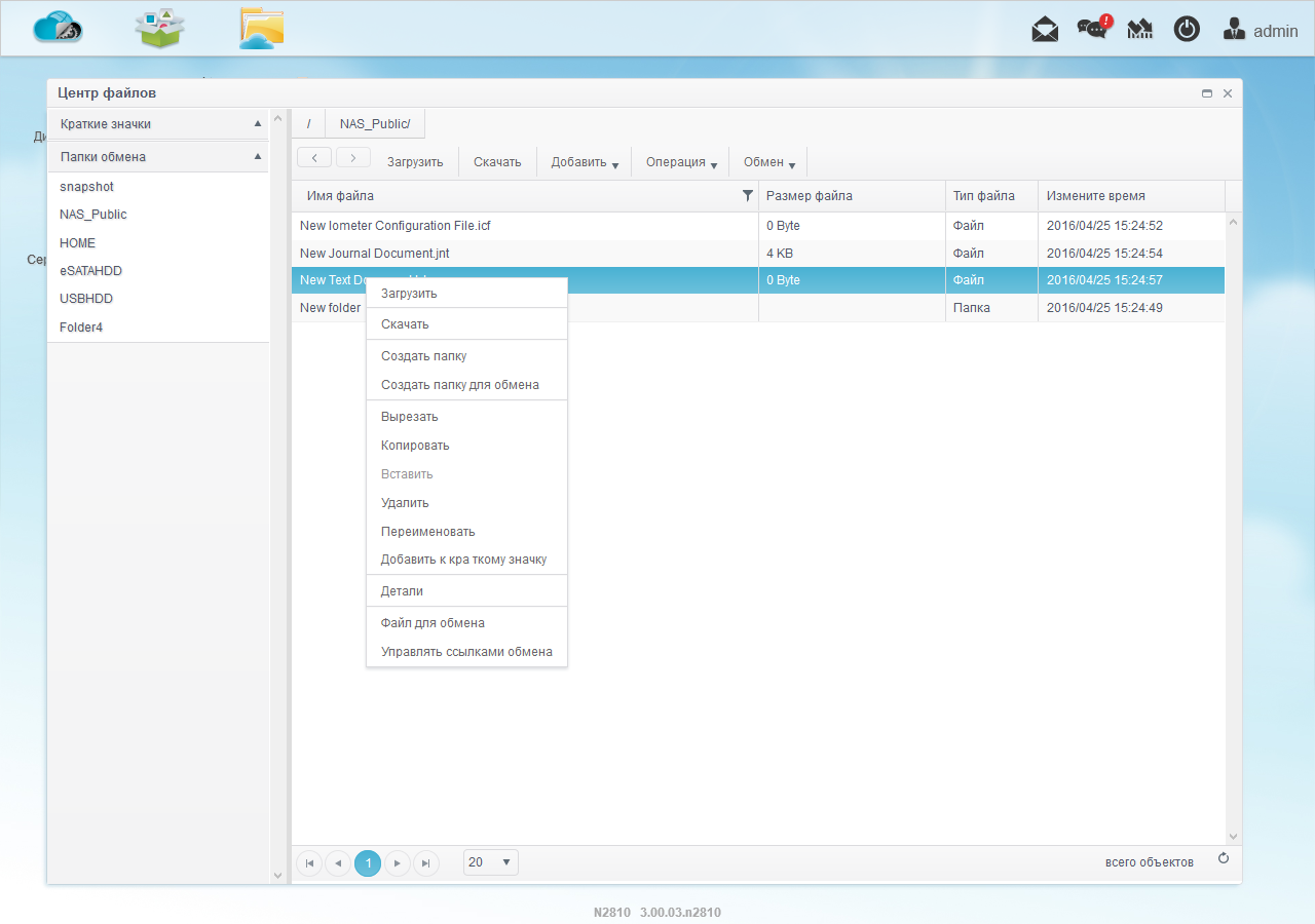 Вполне характерна для данного типа устройств и возможность управления файлами через веб-браузер, что позволяет проводить операции удаленно и без нагрузки на локальную сеть. Реализация «Центра файлов» не очень понравилась своей неторопливостью. Впрочем, все основные востребованные операции для файлов и папок здесь представлены, включая копирование, перемещение, удаление и переименование. Также есть пункт создания ссылки для обмена файлами. Правда, если хочется поделиться данными через интернет, нужно будет предварительно настроить роутер.