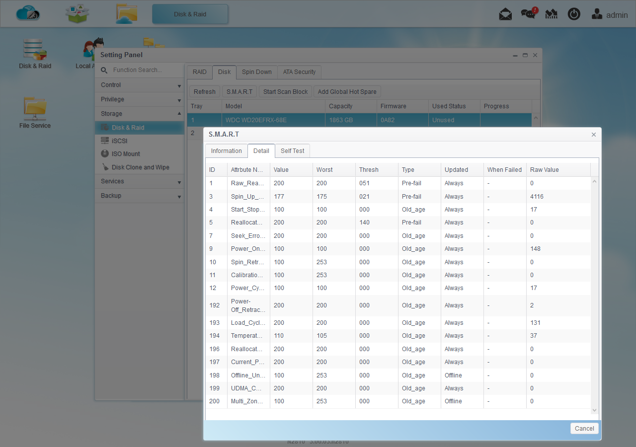 Что касается обслуживания жестких дисков, то есть контроль состояния S.M.A.R.T., запуск встроенных тестов в ручном режиме и сканирование поверхности. Отметим, что есть поддержка горячей замены дисков.