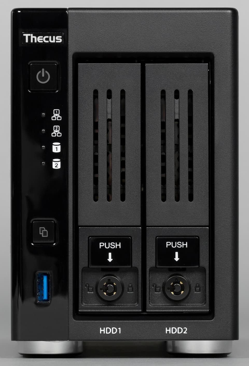 Рассмотренная в этой статье двухдисковая модель Thecus N2810 основана на современной платформе с SoC Intel Celeron, имеет 2 ГБ оперативной памяти, которую можно расширить самостоятельно, оборудована парой гигабитных сетевых портов, а также поддерживает USB 3.0 и может быть подключена к телевизору через выход HDMI. Все это упаковано в компактный корпус, в котором предусмотрена горячая замена дисков.