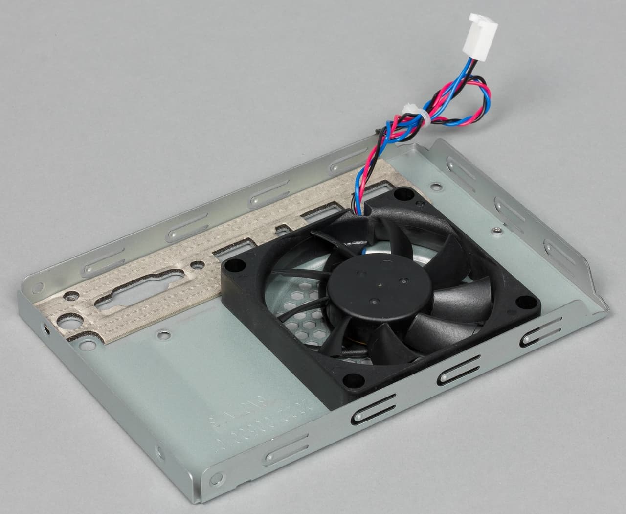 За охлаждение системы (и дисков, и процессора) отвечает вентилятор Delta AFB0712HC формата 70×70×13 мм с трехпроводным подключением и автоматическим выбором скорости вращения. Заменить его достаточно сложно из-за относительно редкого формата.