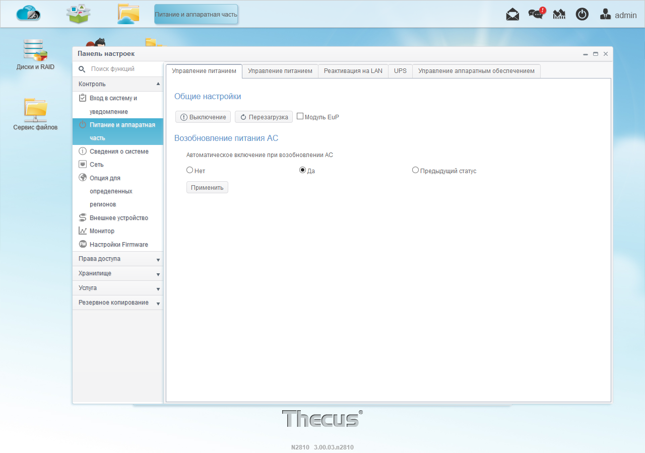 Сервер имеет достаточно богатые возможности по управлению питанием. Есть режим установки расписания работы, отключение дисков в случае отсутствия активности, работа с ИБП, автоматическое включение при восстановлении питания, WOL на сетевых портах.