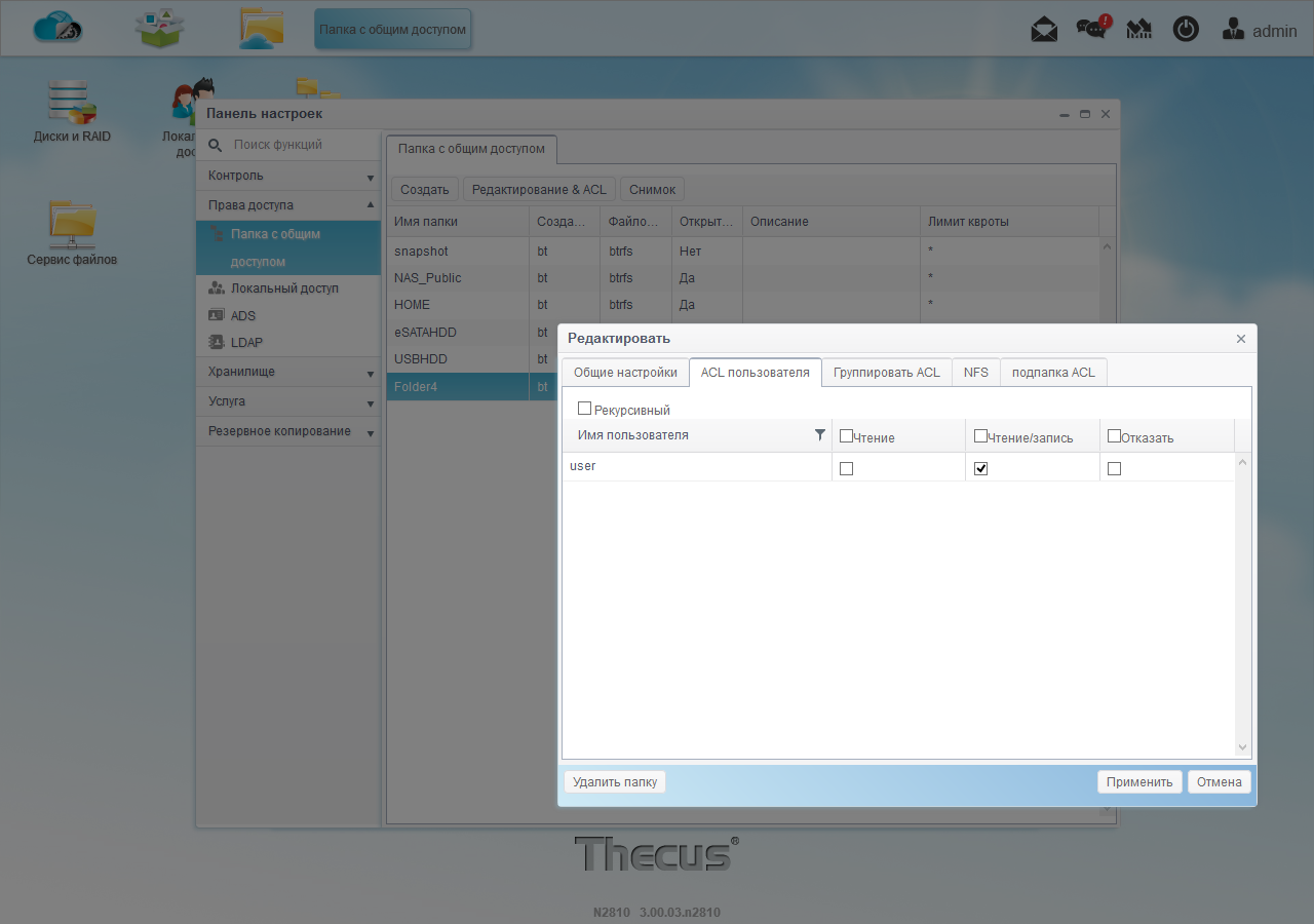 Из дополнительных возможностей отметим поддержку дисковых квот для пользователей, а также резервное копирование и восстановление базы пользователей и прав доступа для томов. Заметим, что есть поддержка ACL и для подпапок. Права для них можно изменить через веб-интерфейс.