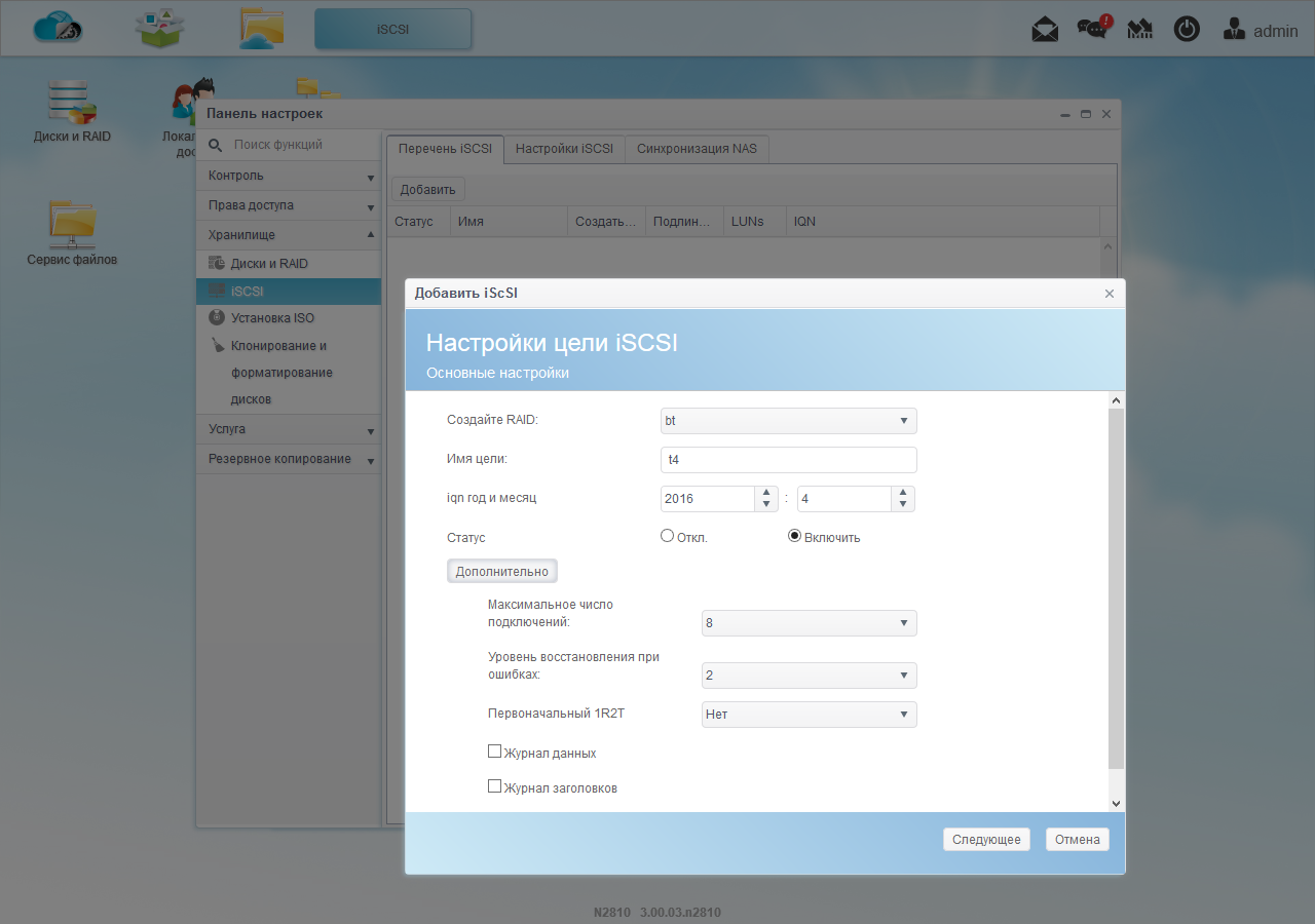 Сетевой накопитель также можно использовать и для организации томов iSCSI, место для которых выделяется в файловом режиме на существующих дисковых массивах. Есть и другой вариант использования этого протокола: подключение удаленных томов к N2810.
