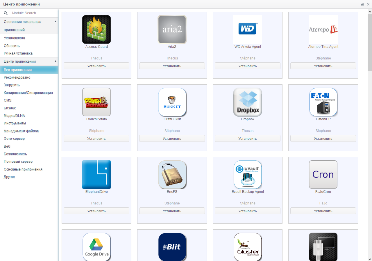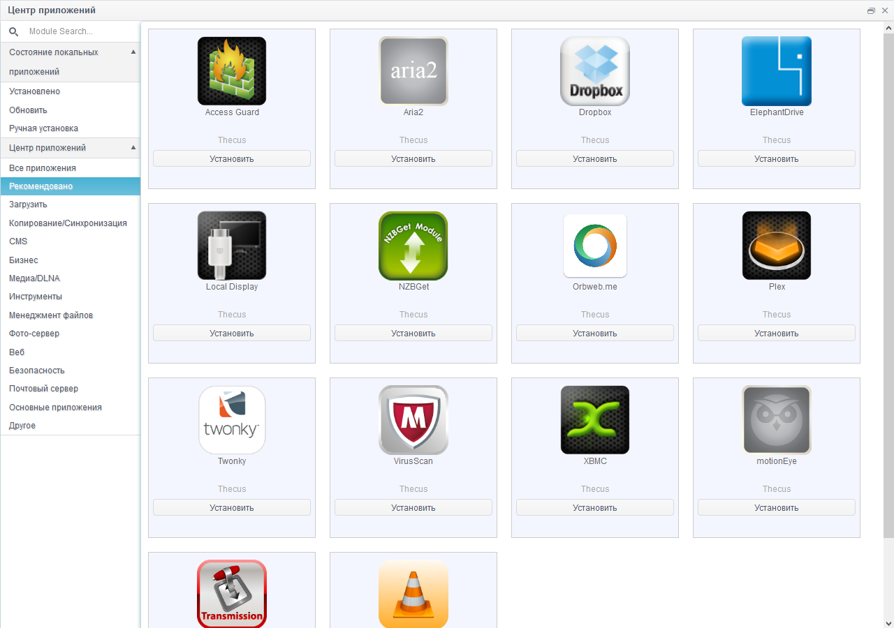 На момент проведения тестирования для данной модели накопителя в каталоге «Центра приложений» было представлено около пятидесяти программ, сгруппированных по категориям: например, «Бизнес» и «Медиа». Из них четырнадцать приложений — разработки компании Thecus. Посмотрим на них внимательнее.