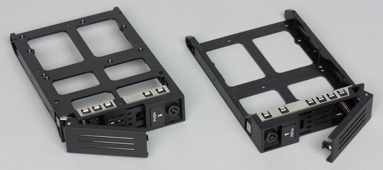 Передняя панель из пластика состоит из двух половинок — матовой части справа, на которой размещаются дисковые отсеки, и вертикальной глянцевой вставки с кнопками, индикаторами и портом USB 3.0 слева. Дисковые отсеки имеют привычные защелки, которые дополнительно можно закрыть на ключ. Сами рамки для дисков выполнены из пластика, но в передней части и в замках используется металл.