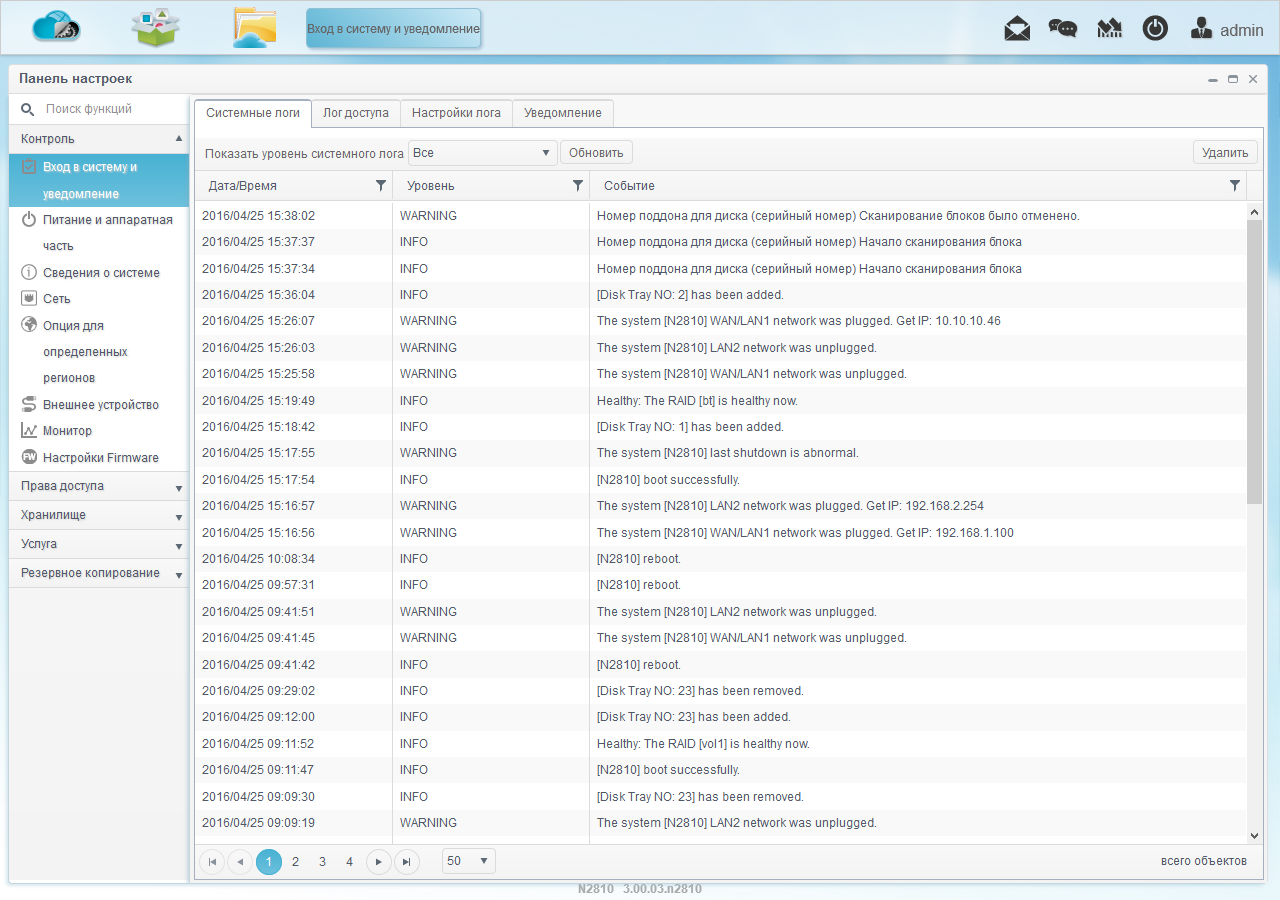 Система ведет внутренний журнал событий, а также может записывать сетевую активность, связанную с некоторыми протоколами, включая FTP, SMB, AFP, iSCSI. Поддерживается отправка данных на удаленный сервер Syslog и создание собственного сервера для обслуживания других устройств.
