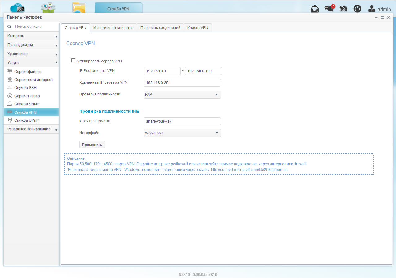 Второй встроенный сервис — сервер и клиент VPN. Причем в первом случае речь идет о протоколе IPSec, а во втором — о PPTP, что несколько необычно. Подобное решение позволяет организовать удаленный защищенный доступ к устройству. Тестирование показало, что устройство достаточно быстрое в этом сценарии и обеспечивает скорость более 110 Мбит/с.