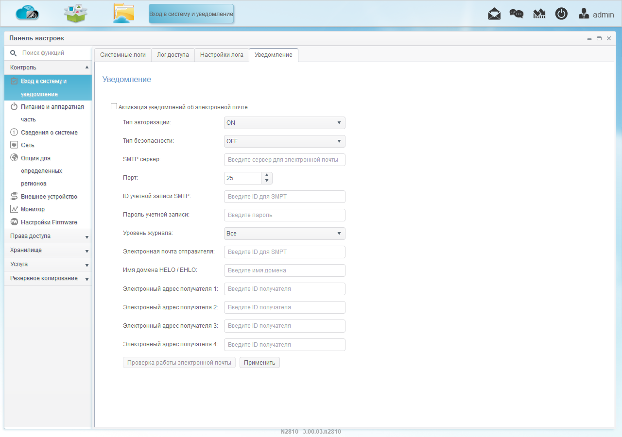 Система уведомлений работает по электронной почте с применением внешнего сервера SNMP. Получателей может быть максимум четыре. Фильтрация сообщений минимальная: только по уровню важности события.