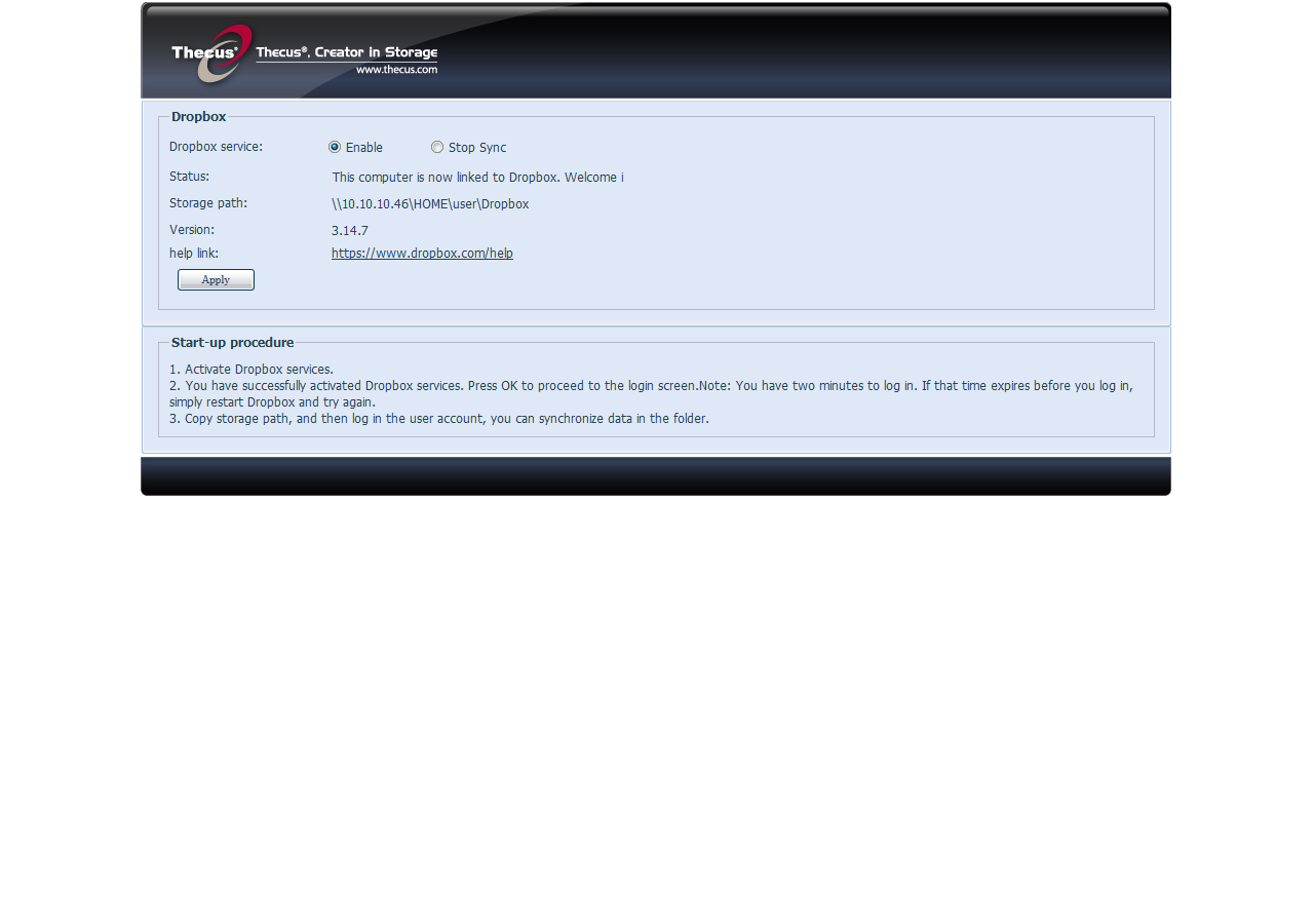 Кроме упомянутого в описании сервиса резервного копирования, Thecus предлагает еще два варианта работы с облаками. Модуль Dropbox позволяет вам настроить автоматическую синхронизацию локальной папки в домашней директории пользователя с облачным хранилищем. К сожалению, возможности использовать только поддиректорию на удаленном сервере мы не нашли. Кроме того, остается вопрос в настройке сервиса одновременно для нескольких пользователей сетевого накопителя.