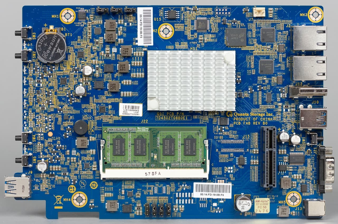 Контроллеры SATA и USB 3.0 встроены в основной процессор. На плате можно также заметить привычный BIOS и дополнительный флэш-диск с образом операционной системы, подключенный по USB. Гигабитные сетевые контроллеры в количестве двух штук представлены чипами Intel i210 на шине PCI Express.